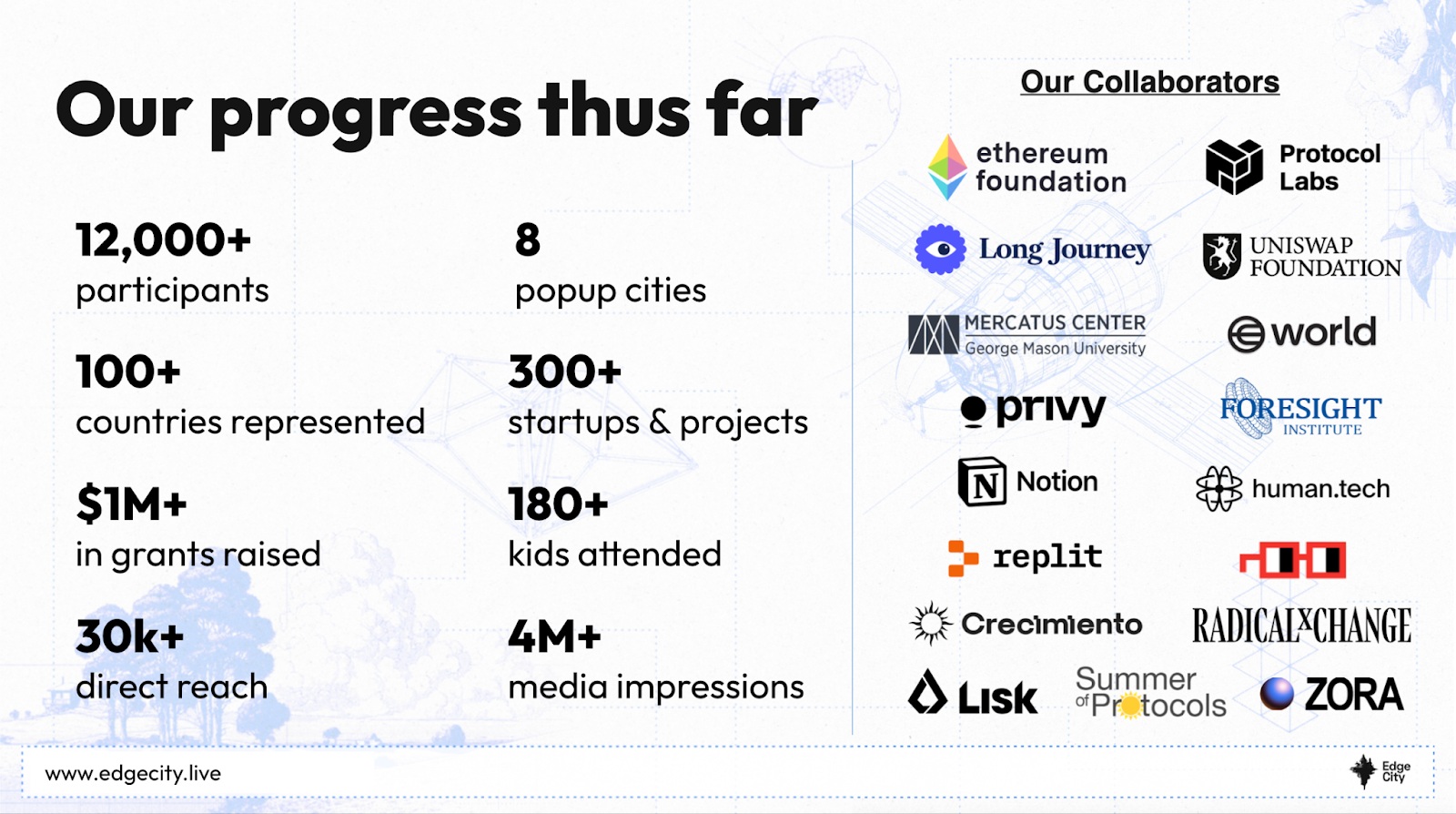 Beyond California, our global roadmap is taking shape. We are currently scouting for Edge City India in Q4, and we are in active planning to return to Bhutan to deepen the collaborations we started this year.