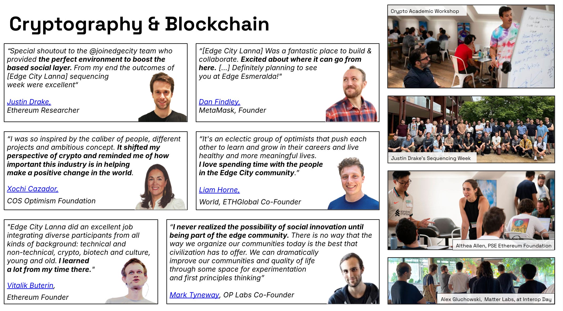 While we've been fortunate to host pioneering figures like Vitalik Buterin, Grimes, Laura Deming, Justin Drake, Juan Benet, Emad Mostaque, and many other leaders across technology, science, and culture, we're equally committed to nurturing emerging talent. Through our fellowship, scholarship, and builder programs, we subsidize participation for promising innovators. This creates a unique environment where established experts and rising stars connect naturally, making Edge City both a gathering point for acknowledged leaders and a launching pad for the next generation of pioneers.