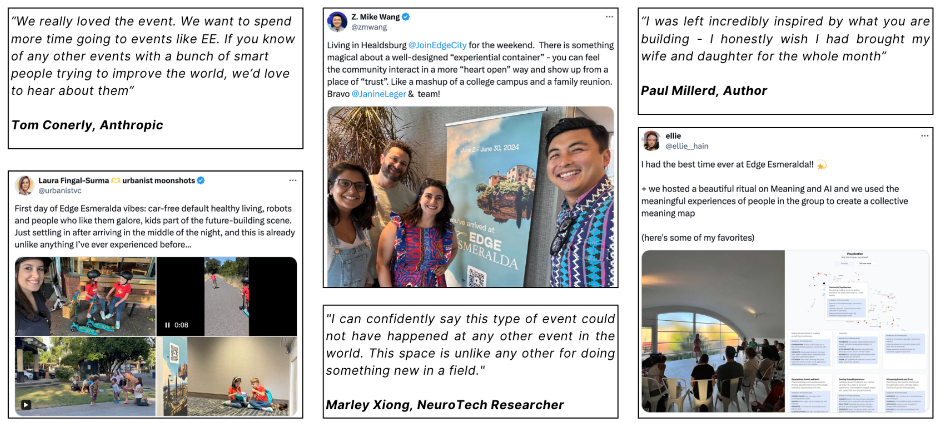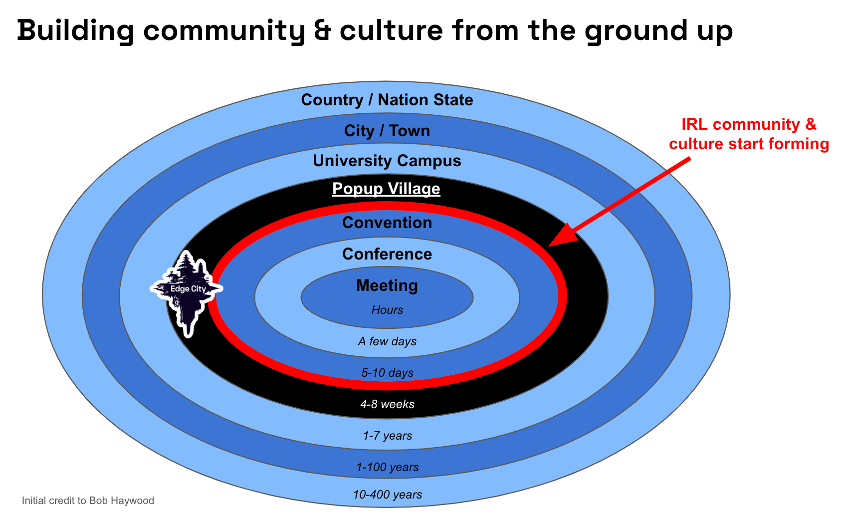 At Edge City, we're betting on culture as our primary catalyst while recognizing that the most powerful transformations happen when cultural and economic incentives work together. The extended format of our events creates the perfect container: when people spend weeks rather than days together, deeper connections form, real progress emerges, and new projects launch. This enables the emergence of new communal identities - something we believe popup villages are uniquely positioned to catalyze. These cultural patterns ripple outward as participants carry them into their networks, making "doing the right thing" not just an incentivized choice, but a natural expression of your community and culture.