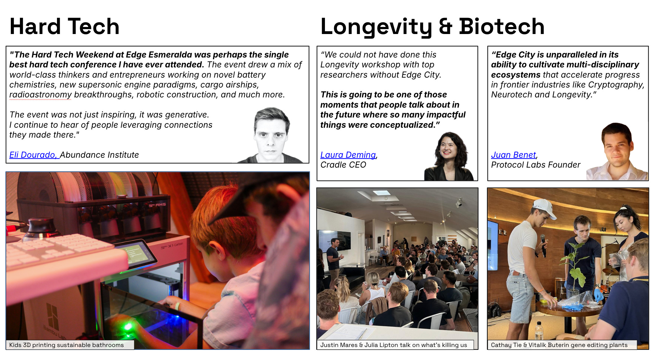 Edge City is dedicated to accelerating human flourishing by convening innovators, scientists, and technologists in immersive temporary villages.
