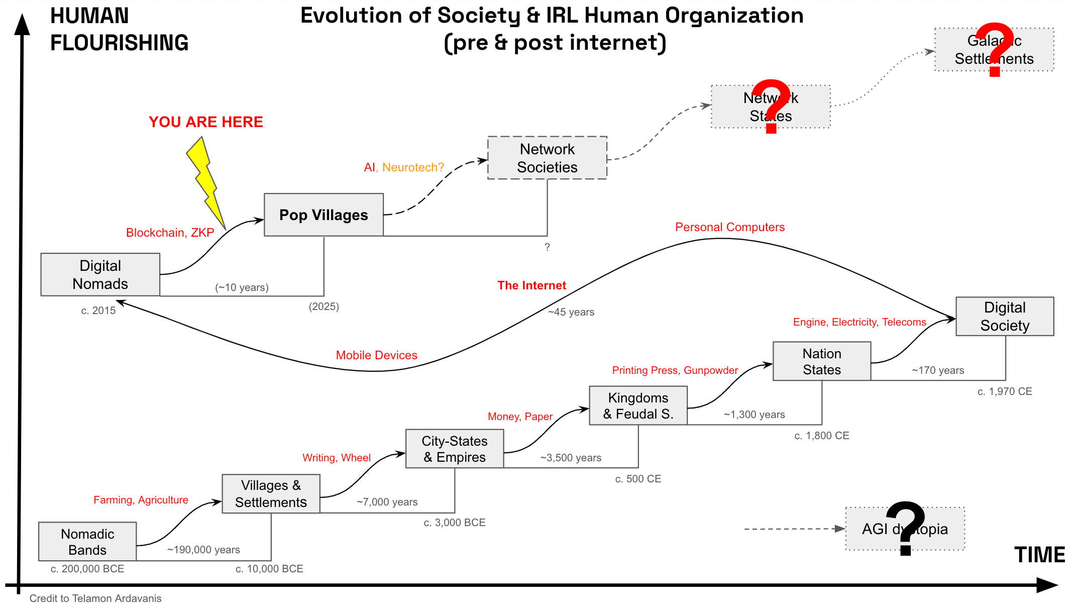 Balaji Srinivasan's concept of Network States offers an intriguing framework for this evolution, envisioning communities forming digital-first nations based on shared values rather than geography - a pattern that mirrors what we're exploring with popup villages. We're already seeing early signals of this shift: remote work enabling digital nomadism, individuals stacking passports and relocating to tax-friendly jurisdictions, and people increasingly "voting with their feet" as they follow preferred policies, better weather and opportunities. What was once considered a luxury lifestyle is becoming increasingly accessible as travel costs decrease, global prosperity grows, and infrastructure improves. The question isn't just whether we're supposed to be nomadic, but whether we can create new forms of human organization that transcend the traditional dichotomy between settled and nomadic life. As we stand at this intersection of multiple transformative technologies, with more people than ever able to choose where and how they live, we have the opportunity to consciously shape how these trends influence our social structures and ways of living.