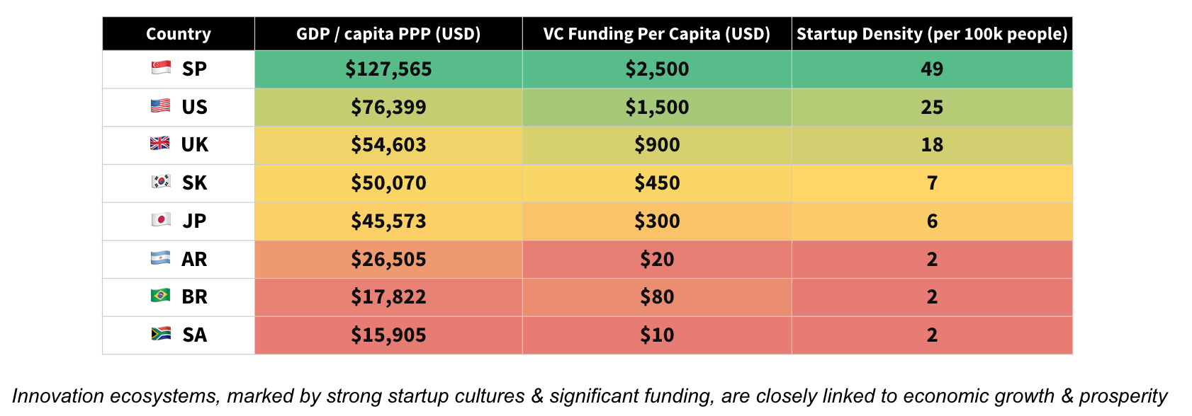 I believe the implications for global prosperity are significant. By nurturing startup cultures and innovation mindsets in communities around the world, we can unlock new sources of opportunities, economic growth and shared development. Countries with higher startup densities per capita tend to enjoy higher GDP per capita as well, suggesting that democratizing entrepreneurial opportunities can be a powerful driver of global progress. Creating more "popup villages" that foster local innovation ecosystems has the potential to spur job creation, inject new ideas into the global innovation pipeline, and fundamentally reshape the geography of prosperity worldwide. Exporting the culture of entrepreneurship, founders, and innovation to accelerate startup ecosystems beyond traditional hubs represents an opportunity to unlock the full economic value of human creativity and problem-solving on a truly global scale.